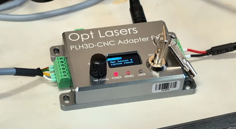 - A gray cable connects the laser module to the Opt Lasers adapter/controller.